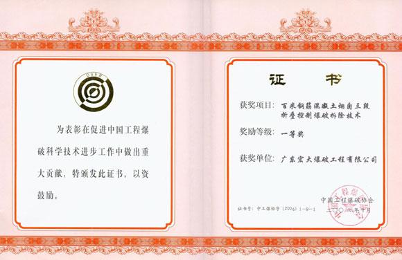 2006年10月22日至10月25日,我司在中国工程爆破协会举行的会议上,“百米钢筋混凝土烟囱三段折叠控制爆破拆除技术”荣获中国工程爆破协会一等奖,“84.8m高薄壁双曲线冷却塔控制爆破拆除技术”荣获中国工程爆破协会二等奖。