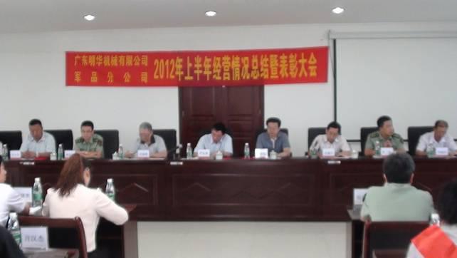 9月12日上午,军品分公司顺利召开了上半年生产经营情况总结及表彰先进大会。会议由宏大公司执行总经理方健宁同志主持,省经信委军工处处长罗化林、广州军代室总代表傅振宇、广业公司党委副书记、纪委书记洪旗歌、宏大公司董事长、总经理郑炳旭、副总经理、明华公司总经理郑永伟等领导出席了本次大会。