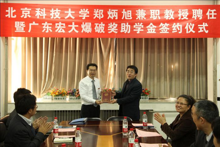 郑教授在仪式上对北科大聘他为兼职教授表示衷心感谢,郑教授说:这不仅是他个人的荣誉,也是整个宏大公司的荣誉。今后,他愿为北科大的发展贡献自己的绵薄之力,宏大公司也将继续履行上市公司的社会责任,继续与北京科技大学在课题研究、人才培养、推进科技进步等方面进行深入的合作。