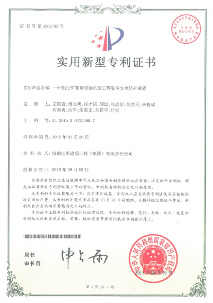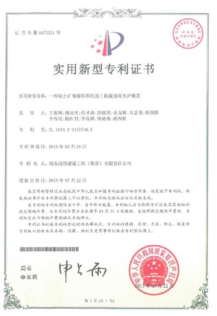 近日,广东宏大爆破股份有限公司控股子公司:湖南涟邵建设工程(集团)有限责任公司(以下简称:涟卲建工)申报的“一种铝土矿巷道综掘机施工机械前探支护装置”、“一种铝土矿巷道综掘机施工驾驶室安全防护装置”、“一种多通道普通导爆索连接器”三项科研成果获国家知识产权局实用新型专利证书。