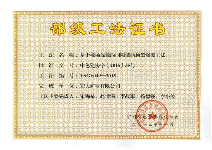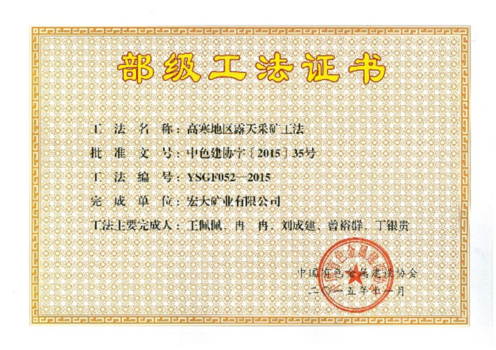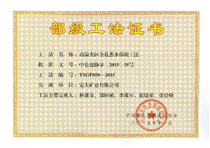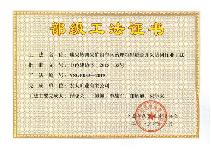 此项成果的获得是对我公司先进施工经验的肯定和鼓励。宏大矿业历来重视工法研究、开发、总结和推广应用工作,注重以工法开发增强企业科技创新能力,鼓励员工积极采用新技术、新工艺、新材料和新设备,不断提高施工技术水平和工程质量。
