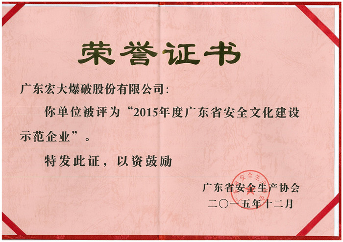 近日,广东宏大爆破股份有限公司收到广东省安全生产协会下发的《关于命名2015年广东省安全文化建设示范企业的通知》。广东宏大爆破股份有限公司喜获“广东省安全文化建设示范企业”称号,是17家受命名单位之一,在同行业中,宏大爆破是唯一一家。