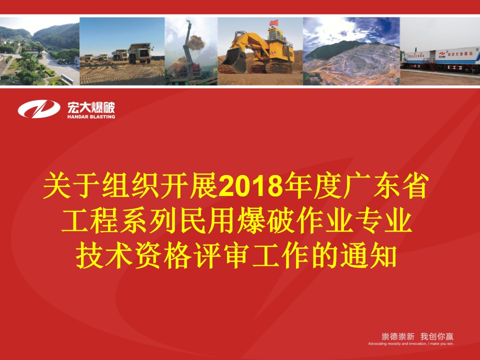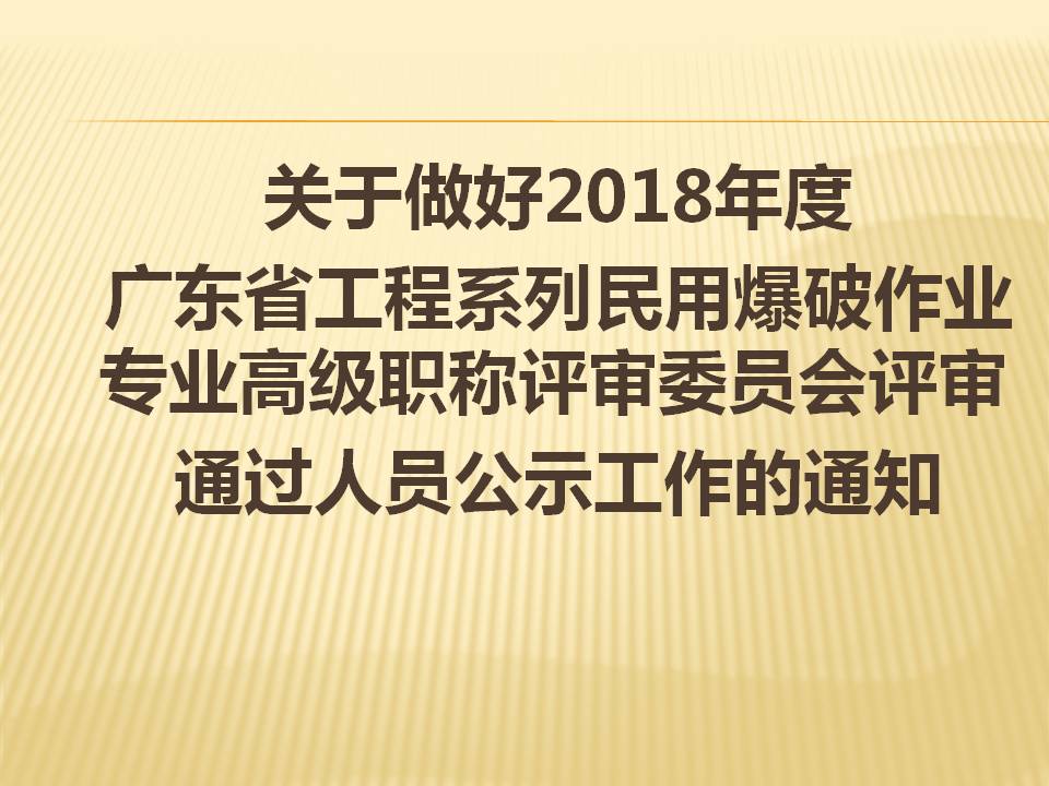 关于做好2018年度广东省工程系列民用爆破作业专业高级职称评审委员会评审通过人员公示工作的通知 各有关单位: 根据原广东省人事厅《关于印发〈广东省高、中级专业技术资格评审委员会评审通过人员公示管理办法〉的通知》(粤人发〔2002〕236号)要求,现将我省2018年度广东省工程系列民用爆破作业专业高级职称评审委员会评审通过人员名单返回你单位进行公示,并同时在广东宏大爆破股份有限公司(www.hdbp.com)网站进行公...