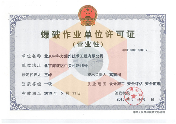 近日,北京市公安局治安管理总队授予广东宏大爆破股份有限公司控股子公司:北京中科力爆炸技术工程有限公司(以下简称:中科力)营业性爆破作业单位许可证一级资质证书。标志着中科力继2013年爆破公司改制分级获得一级资质以来继续保持最高的爆破公司技术和业绩水平。 随着公司爆破资质有效期的临近,公司领导高度重视并组织资质申报小组完成了爆破作业单位营业性资质申报资料的收集、组卷工作,形...