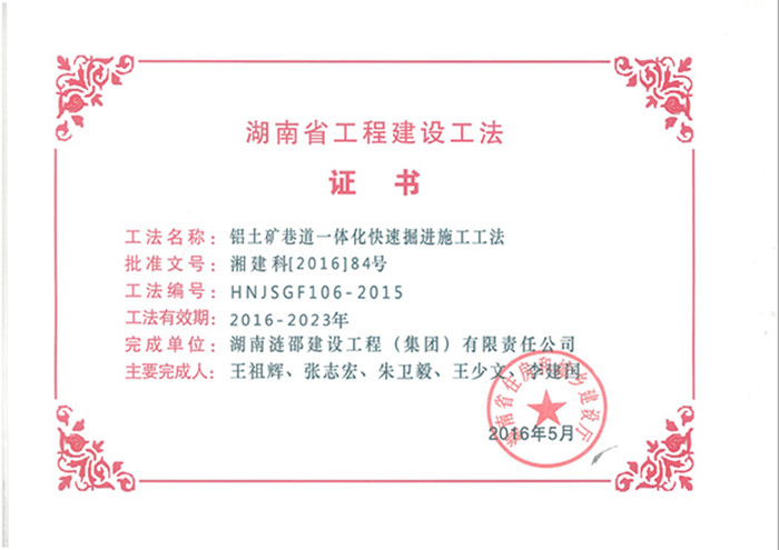 近日,湖南省住房和城乡建设厅下发了《关于公布2015年度工程建设省级工法名单的通知》,涟邵建工申报的《铝土矿巷道一体化快速掘进施工工法》、《暗竖井小导硐反井钻机施工工法》、《矿山方形竖井快速施工工法》三部工法,审定为2015年度工程建设省级工法。 《铝土矿巷道一体化快速掘进施工工法》适应铝土矿巷道一体化快速掘进施工,通过选用先进施工机械设备,采取掘进机截割破岩、弱爆破法辅助破...