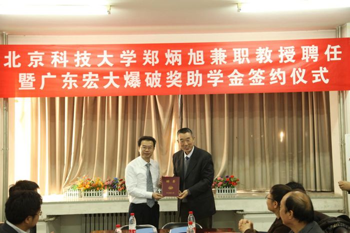 ??? 11月18日,北京科技大学隆重举行了郑炳旭兼职教授聘任仪式暨宏大奖(助)学金签约仪式。北京科技大学研究生院常务副院长、土木与环境工程学院院长吴爱祥,北科大校友会、教育发展基金会办公室副主任吕朝伟,土木与环境工程学院副院长纪洪广等,广东宏大爆破股份有限公司董事长郑炳旭,湖南涟邵建工集团总经理李萍丰、总工程师欧立明、宏大公司副总工宋锦泉等参加了本次仪式。仪式由土木与工程学院党委副书记...