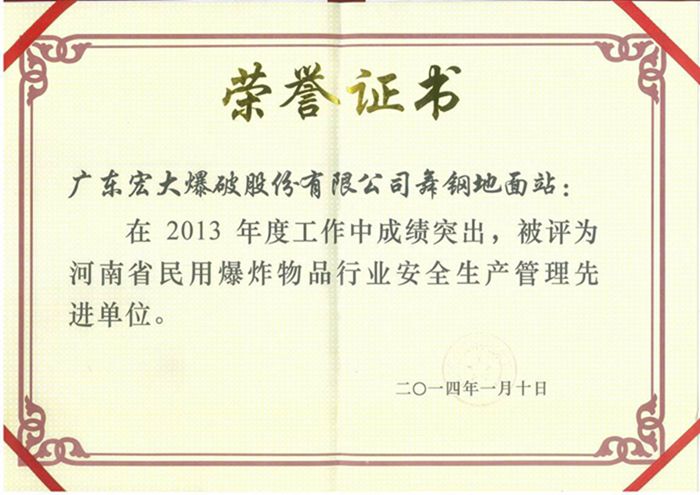 1月13日,在河南省国防科学技术工业局主持召开的2014年全省民用爆炸物品行业安全生产工作会议上,我公司河南舞钢地面站获得2013年度“河南省民用爆炸物品行业安全生产管理先进单位”称号,其中周伟光同志被评为2013年度“河南省民用爆炸物品行业安全生产管理先进工作者”。 混装业务部 申卫峰