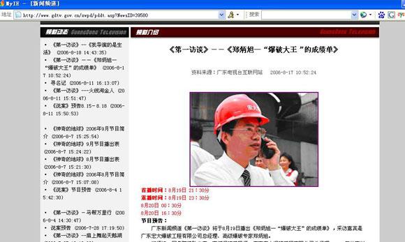 近日,广东新闻频道采访了我司总经理、高级爆破专家郑炳旭,广东新闻频道《第一访谈》于8月19日播出了《郑炳旭—“爆破大王”的成绩单》节目。 详细信息请浏览以下地址 http://www.gdtv.gov.cn/xwpd/pddt.asp?NewsID=39580
