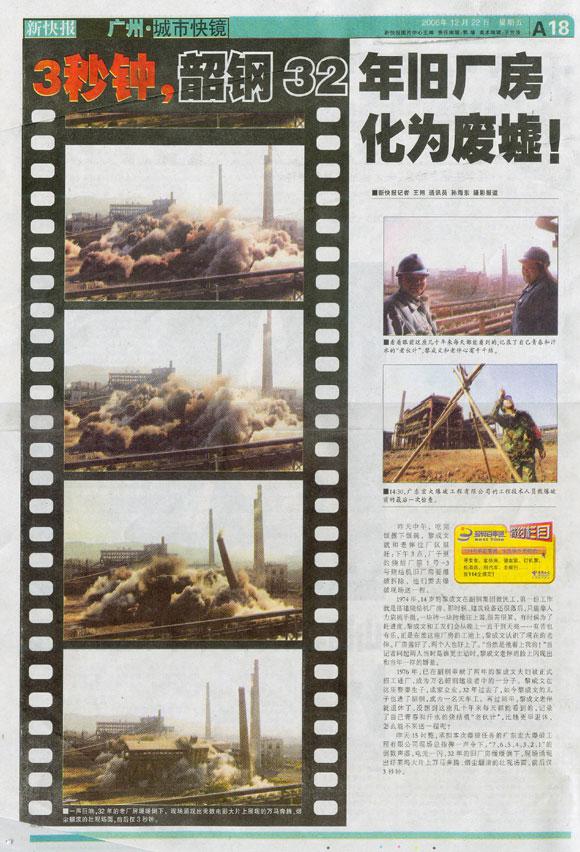 2006年12月21日下午3时,在我司现场总指挥的一声令下,“7、6、5、4、3、2、1”的倒数声落,32年的旧厂房和烟囱缓缓倒下,现场涌现出万马奔腾、烟尘翻滚的壮观场面,前后仅3秒钟。