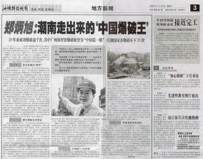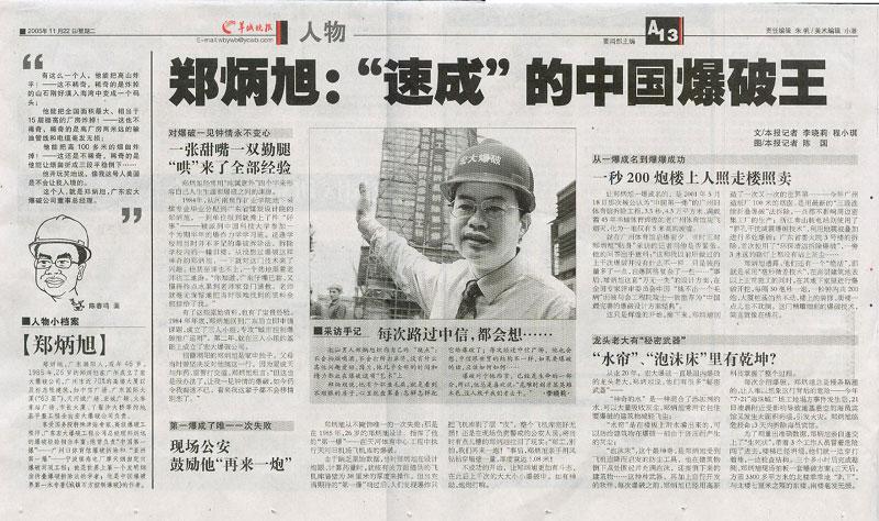 " 2005年11月21日,羊城晚报记者来我公司对郑炳旭总经理进行了人物专访,并于22日发表了题为《郑炳旭:“速成”的中国爆破王》的文章。 "