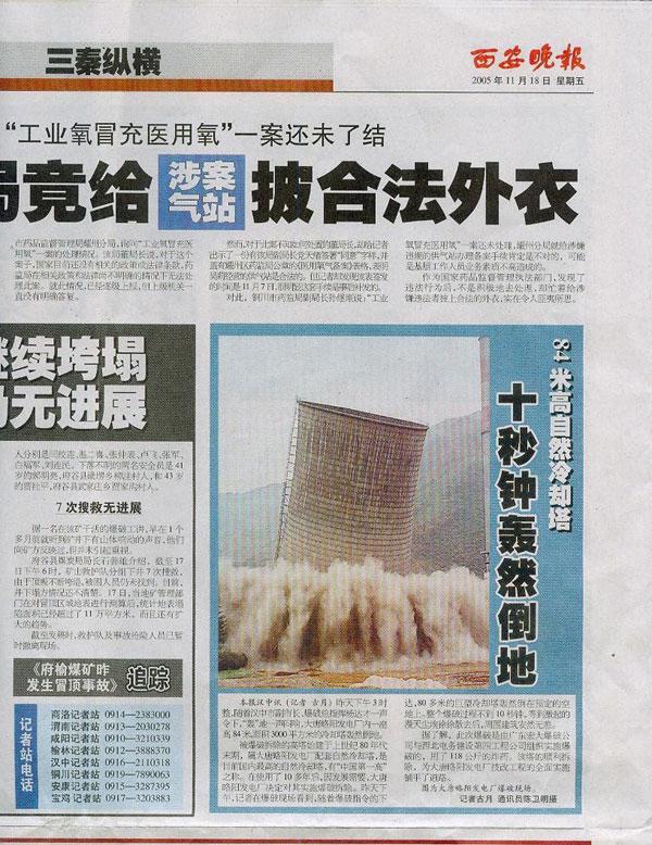 “十·九·八···一,起爆”,随着总指挥一声令下,陕西略阳发电厂冷却塔轰然倒下,这座由我公司爆破设计、指导,西北电力四建施工的大型建筑物,于11月17日下午3时成功爆破拆除。 陕西略阳发电厂冷却塔是目前国内拆除建筑物中最高最大一座,它高85m,相当于38层高的居民楼,塔底部直径70m,有一座体育馆那么大,它相当与一栋100000平方米的超大型建筑。由于这一座庞然大物“又高又...