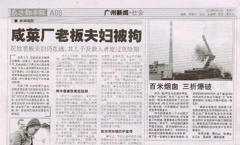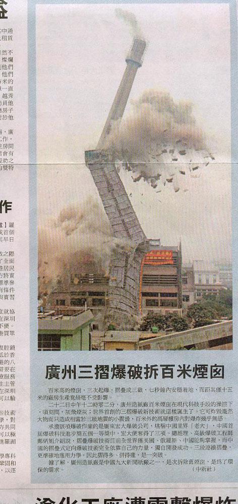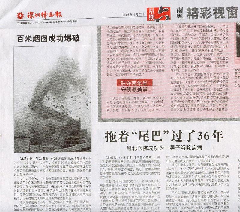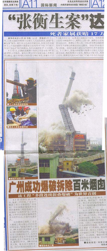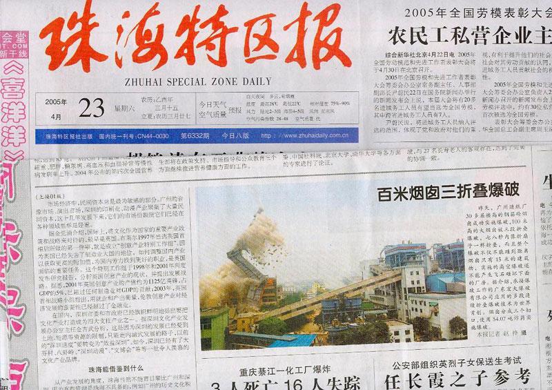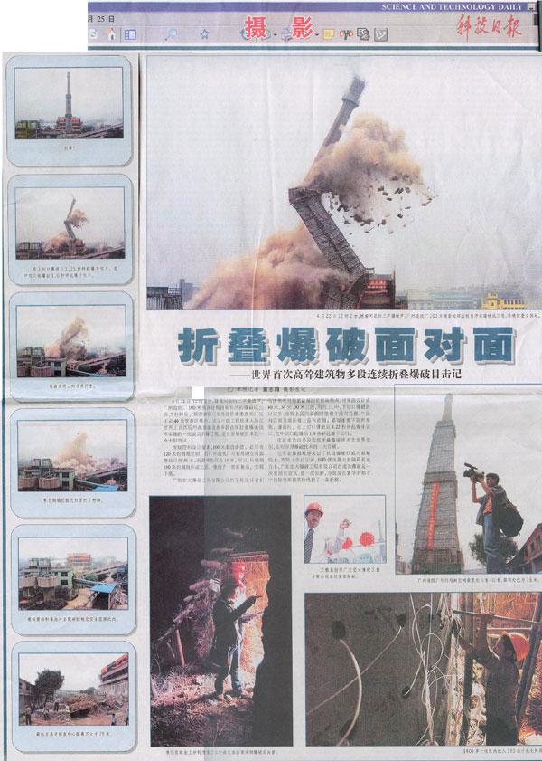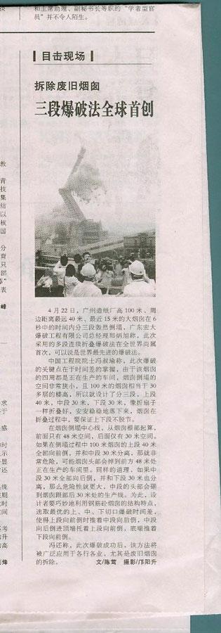2005年4月,广州造纸厂百米烟囱多段连续折叠爆破拆除工程成功实施,公司首创的多段折叠爆破技术得到实践检验,中央电视台等20多家媒体见证了这一爆破界的新奇迹。